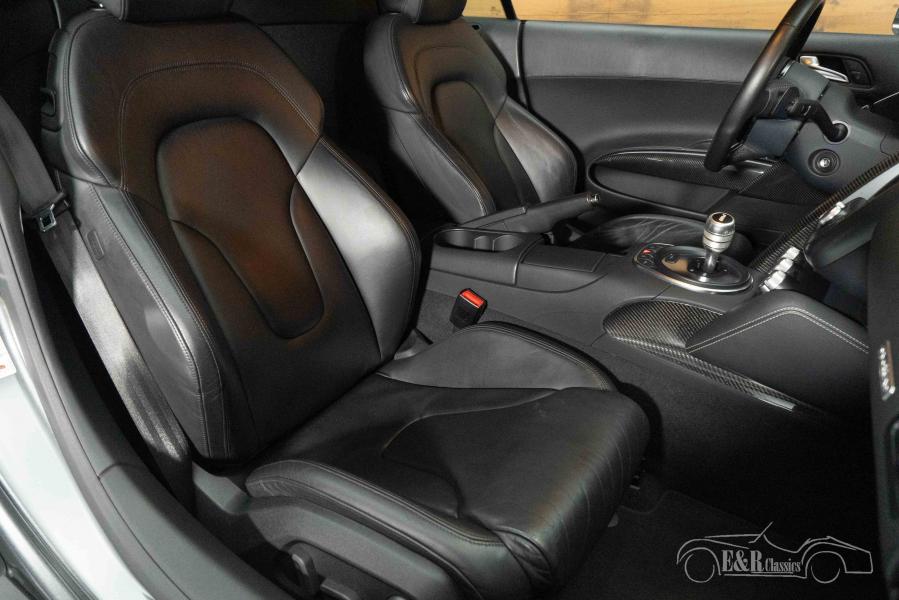 El R8 luce una elegante pintura gris que contrasta a la perfección con las pinzas de freno azules y las llantas deportivas. Los característicos flaps laterales de carbono y el acabado interior realzan el carácter de alto rendimiento de este coche. En su interior, disfrutará del lujo: asientos deportivos de cuero negro con ajuste eléctrico y calefacción, un sistema de audio Bang & Olufsen premium, detalles en carbono y comodidades modernas como climatizador, control de crucero, sensores de aparcamiento en todas las posiciones y sistema de navegación. La combinación del interior oscuro y la carrocería gris garantiza una estética deportiva y atemporal.