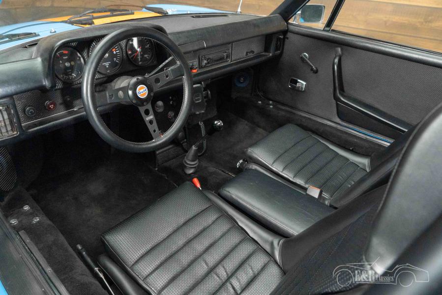 The appearance of this Porsche 914 is a real eye-catcher thanks to the striking Gulf blue paintwork with orange accents, inspired by the legendary Le Mans racing cars. The black Fuchs-style rims give the car a sporty look that perfectly matches its heritage. The removable Targa roof ensures an open driving experience on sunny days. The interior is also taken care of down to the last detail: black sports seats, a sports steering wheel with Gulf logo and a sleekly finished dashboard provide a cockpit feeling that fits perfectly with the rest of the design. The combination of the interior and exterior exudes pure motorsport and makes this Porsche 914 a unique appearance.