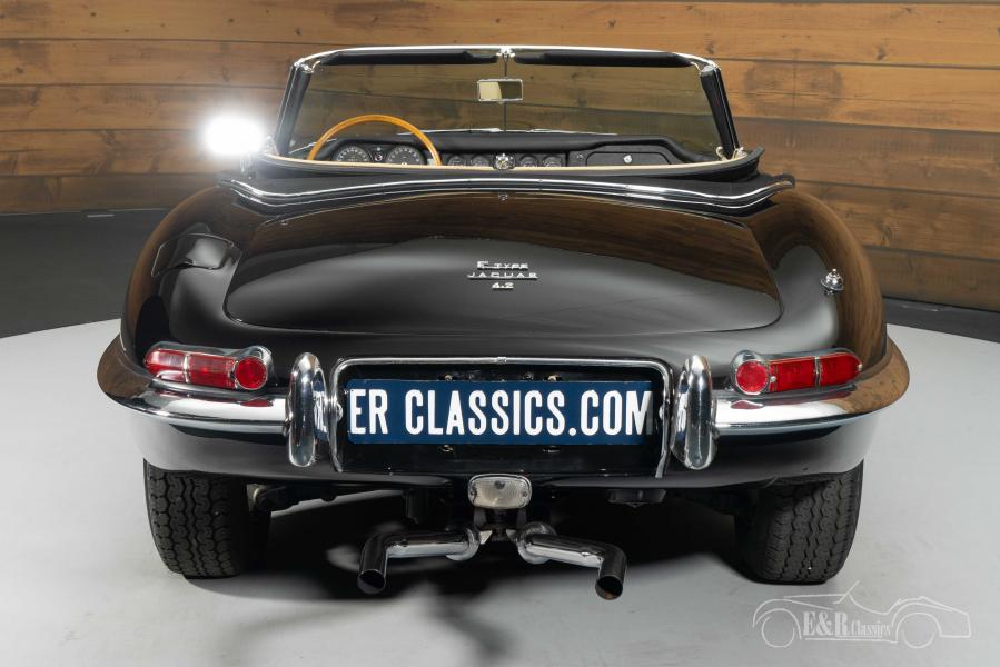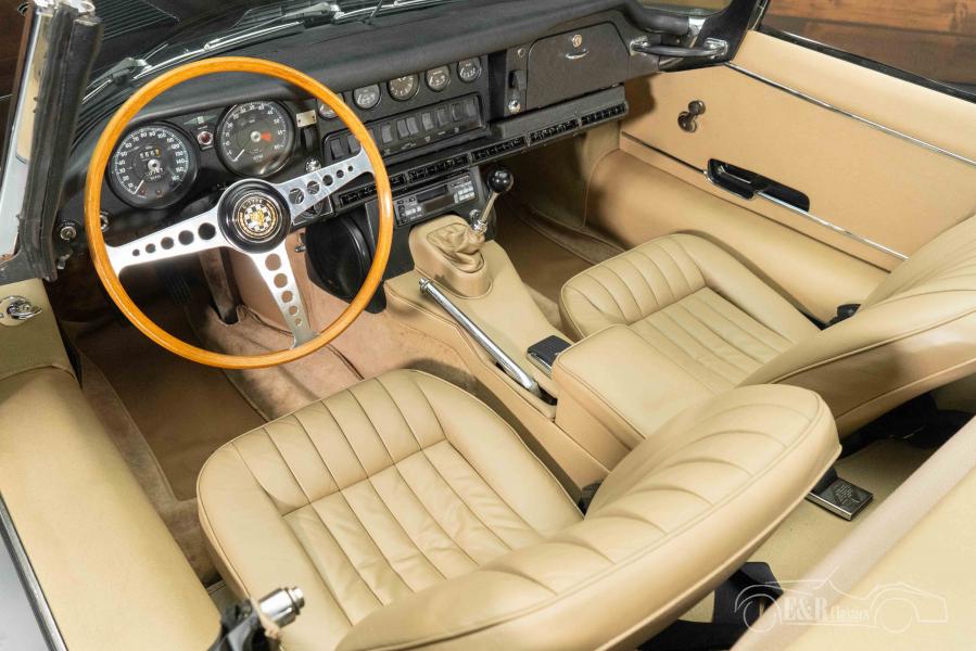 La carrocería está pintada en negro intenso, lo que contrasta a la perfección con los detalles cromados y las impresionantes llantas de radios cromados. La capota de lona negra luce elegante tanto abierta como cerrada, mientras que el interior de cuero beige ofrece un ambiente cálido y lujoso. La combinación del elegante exterior y el luminoso interior le da al coche una sensación de exclusividad. El volante de madera y el salpicadero clásico completan el conjunto y subrayan la artesanía británica que hace tan especial a este E-Type.