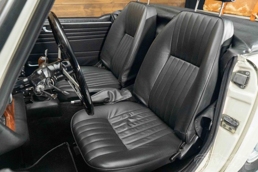 The exterior features stylish Old English White paintwork that contrasts beautifully with the black soft top. A luggage rack with a classic trunk is located at the rear, giving the car a charming vintage look. The original steel wheels with chrome details complete the timeless design. Inside, we find luxurious bucket seats with headrests in black leatherette, a wooden dashboard with classic instruments, and a sporty steering wheel. The interplay of wood, chrome, and leather creates a warm, authentic atmosphere that perfectly suits the character of this British roadster.