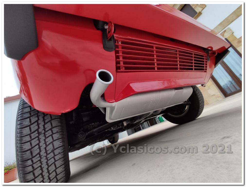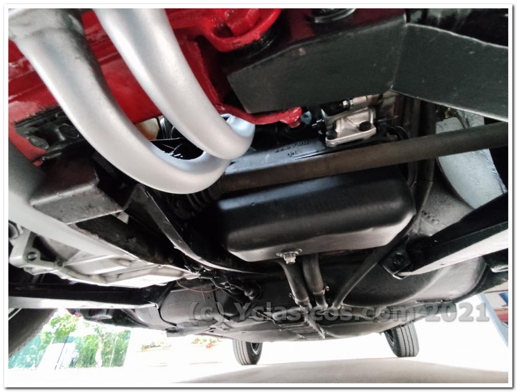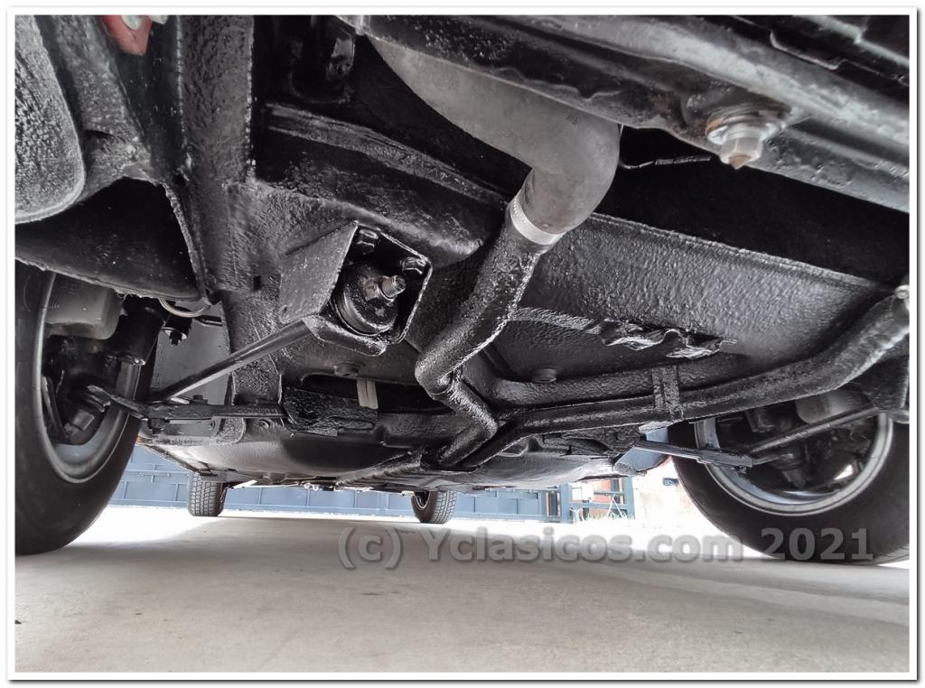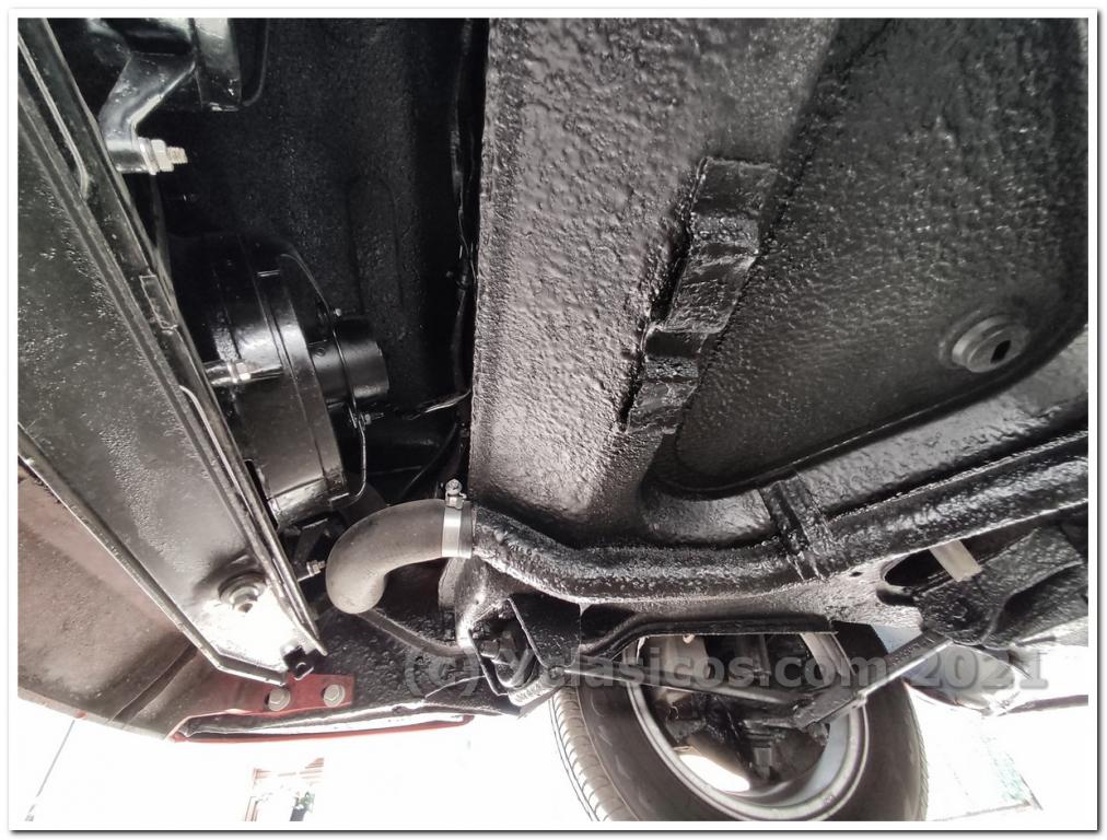 El tubo de escape se limpió y pintó, pero es el original. En esta pieza se palpan muy bien los 45.000km reales que tiene este coche de 41 añitos.