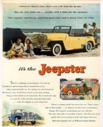 1948 - Nace el Willys Jeepster. Solamente se producen 19.000 vehículos entre 1948 a 1950. Otro intento de ofrecer un nuevo producto de Jeep fue el Jeepster en 1948, un automóvil de apariencia deportiva y convertible que se mantuvo en producción hasta 1951 con el motor Hurricane, y cuyo nombre fue retomado en 1967 con la aparición del Jeepster Commando, disponible en versión cabinada (Station-Wagon) ó Convertible, que se mantuvo en producción hasta 1973.